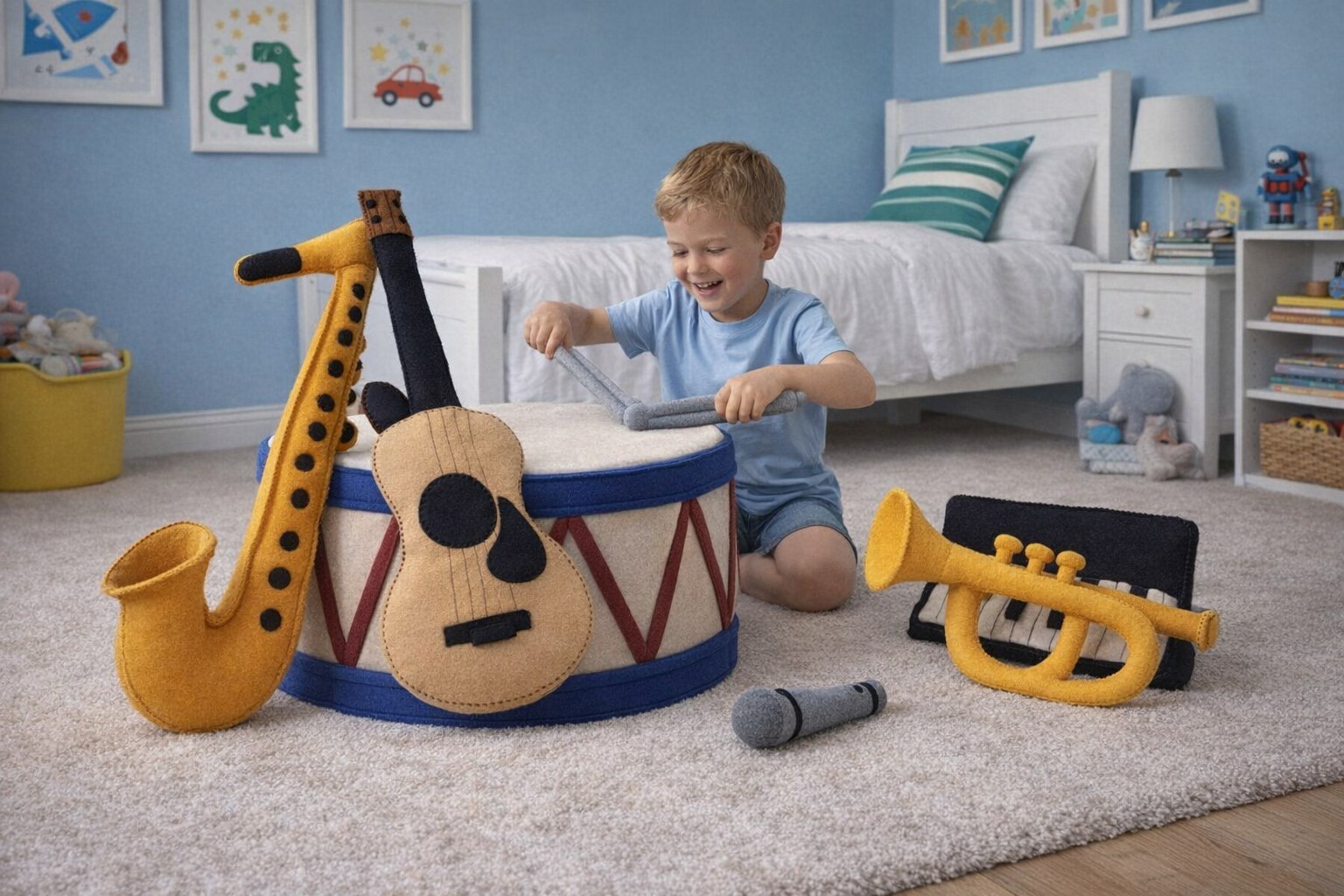 «Уголок музыканта» – это уникальная интерактивная зона, созданная для первых музыкальных экспериментов вашего ребенка. Комплект включает три ключевых инструмента, сшитых из мягких материалов: гитару, пианино и барабан-сиденье. Все они разработаны с учетом детского роста (130 см), чтобы малыш мог легко с ними взаимодействовать, почувствовав себя настоящим артистом.