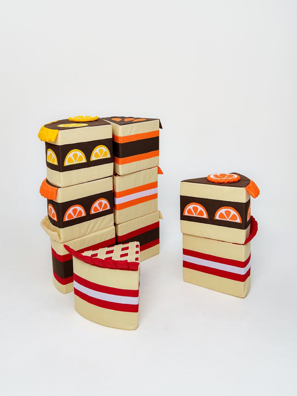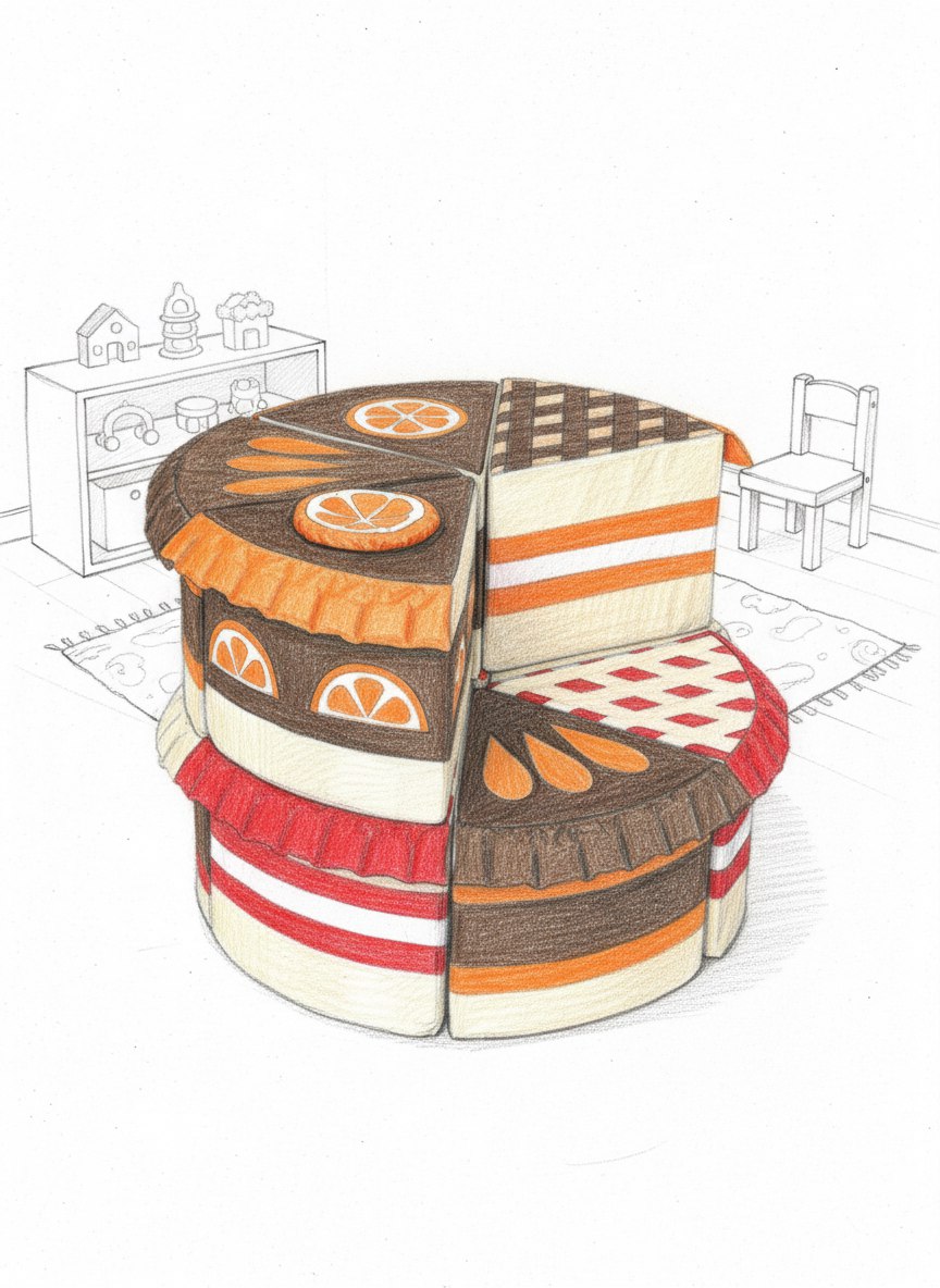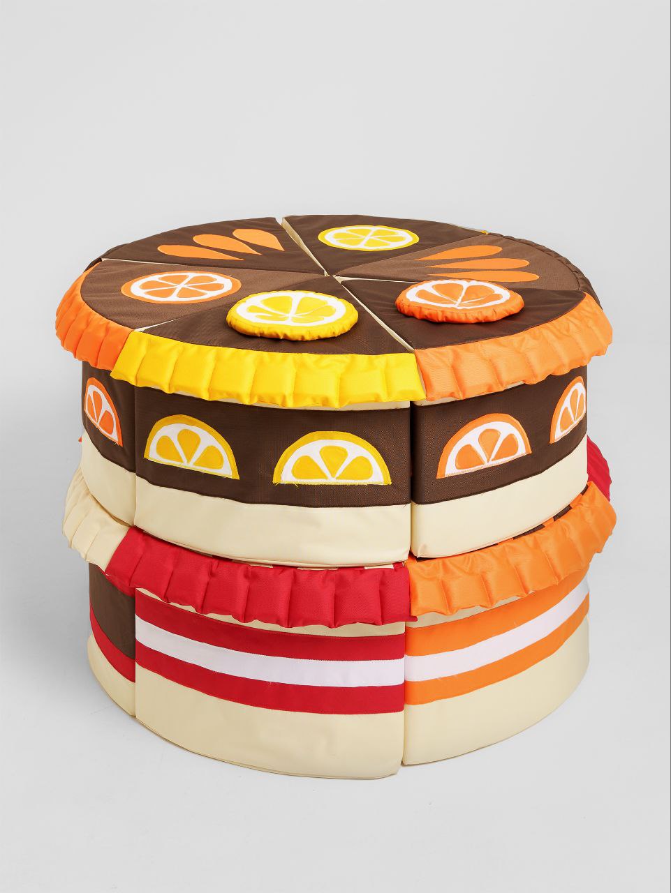 · Основа: Каркас из плотного мебельного поролона, обеспечивающий устойчивую форму и полную безопасность. Торт разделён на несколько секторов-кусочков (например, 4, 6 или 8), которые могут быть как соединены между собой, так и полностью разъёмными для тактильных и счётных игр.